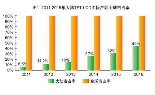 据Quarkdisplay预估,2016年大陆地区大尺寸TFT-LCD面板产能占全球产能比重为40%,中小尺寸TFT-LCD面板产能比重则更高,达到60%,整体TFT-LCD面板产能占全球比重则将由2011年的6.5%迅速增加至2016年的45%,与韩国、台湾两地形成三大生产重心。