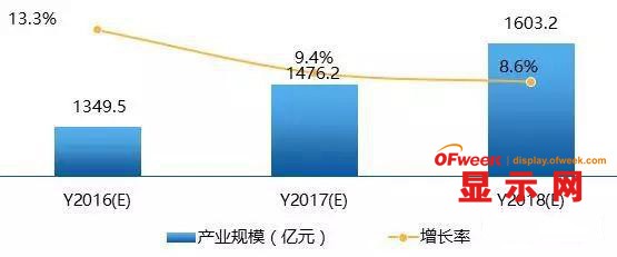 随着国内平板显示器件产业投资热潮的不断延续,未来三年中国平板显示器件产业规模将保持持续增长的势头,但是由于平板显示器件产业下行周期的到来,预计2016年整体产业规模预计为1349.5亿元人民币,同比增长13.3%,增长速度同比下降10.4%;到2017年,更多的产能将被释放,但是市场无法消化过多的产能而导致平板显示器件单品价格下降,整体产业规模预计将达到1476.2亿元人民币,同比增长9.4%;到2018年,中国平板显示器件产业发展将逐步平稳,产业规模增速将保持在8.6%,产业规模将达到1603.2亿元人民币。